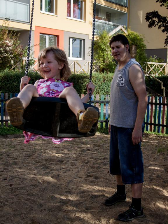 "Žádné kompenzační pomůcky, zbytek zraku mi umožnil veškerou péči zvládat téměř bez problémů, všechno se dá naučit i krmení i přebalování. Když bylo potřeba, tak jsem miminko převlékla i několikrát denně a umýt zadeček také nebyl problém. Na koupání jsme používali lehátko do vany, nákupy a prevence nebyl problém. Hlavně mi hodně pomáhal manžel."