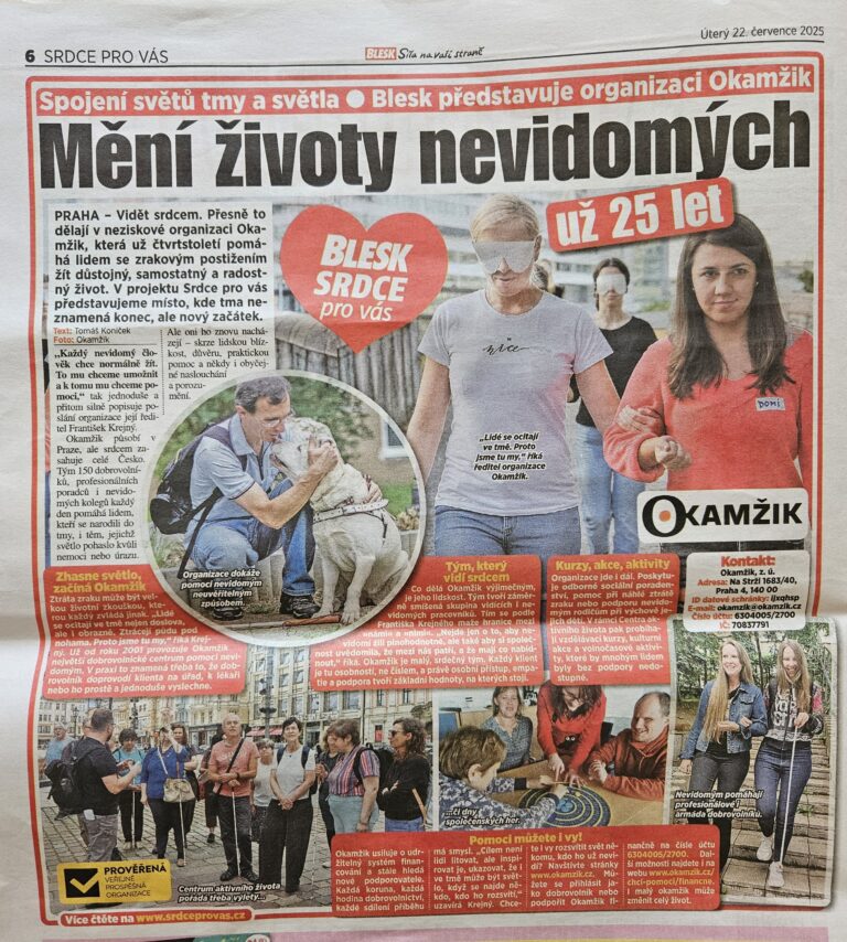 Minulý týden naší organizaci představil deník BLESK v rámci jejich charitativního projektu Srdce pro Vás. V dalších týdnech přinese i příběhy našich klientů.